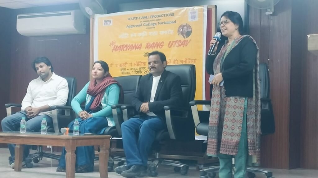 चतुर्थ हरियाणा रंग उत्सव ज्योति संग स्मृति नाट्य समारोह के अंतर्गत अग्रवाल काॅलेज, मिल्क प्लांट रोड, बल्लभगढ़ में रंगमंच पर आधारित सेमिनार और कार्यशाला का आयोजन किया गया। रंगमंच से जुड़े विद्यार्थी और एम0 ए0 हिन्दी साहित्य से जुड़े विद्यार्थियों ने 21वीं शताब्दी में मौलिक हिन्दी नाटकों की चुनौतियों विषय पर हुए सेमिनार के अंतर्गत वक्ताओं को सुनते हुए उनके सामने प्रश्न भी रखे।